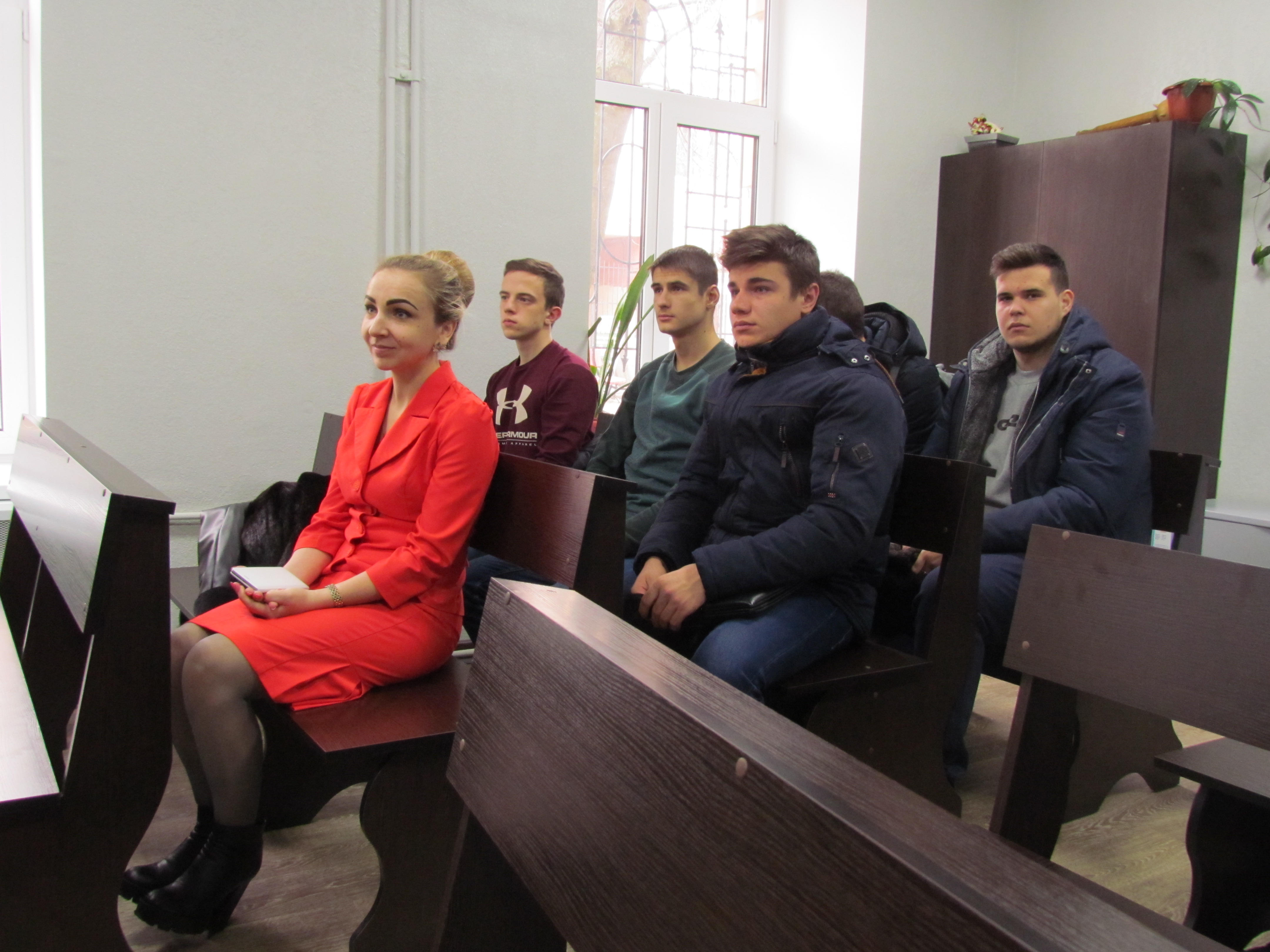 Зустрічали майбутніх правників заступник керівника апарату Руслана Федорова та прес-секретарі суду. «Ми раді Вас вітати в одному із найбільших судів України. Саме в нашому суді першої інстанції розпочинається судовий процес із захисту прав та законних інтересів громадян» – розпочала розмову Руслана Вікторівна. Далі в одному із залів суду, Світлана Біліченко розповіла студентам про історію будівлі суду та ознайомила присутніх із етичними та процесуальними нормами поведінки у приміщені суду. В свою чергу Каріна Тарасова проінформувала присутніх про засади роботи судді, його помічника та секретаря, про процедуру формування та впорядкування справ. Студентам продемонстрували клітку нового зразка – скляне загородження, яке відокремлює підсудних від складу суду й присутніх громадян.