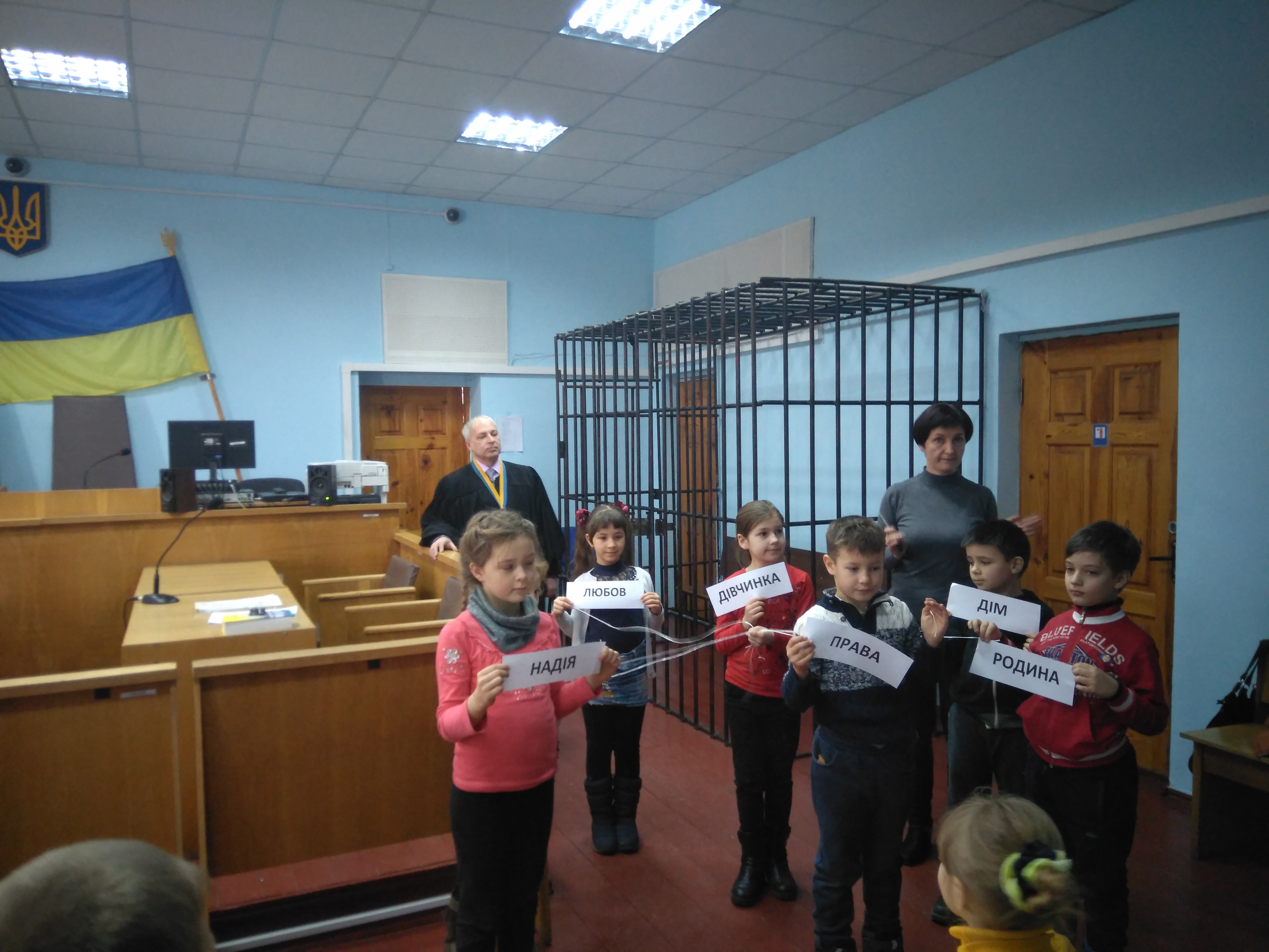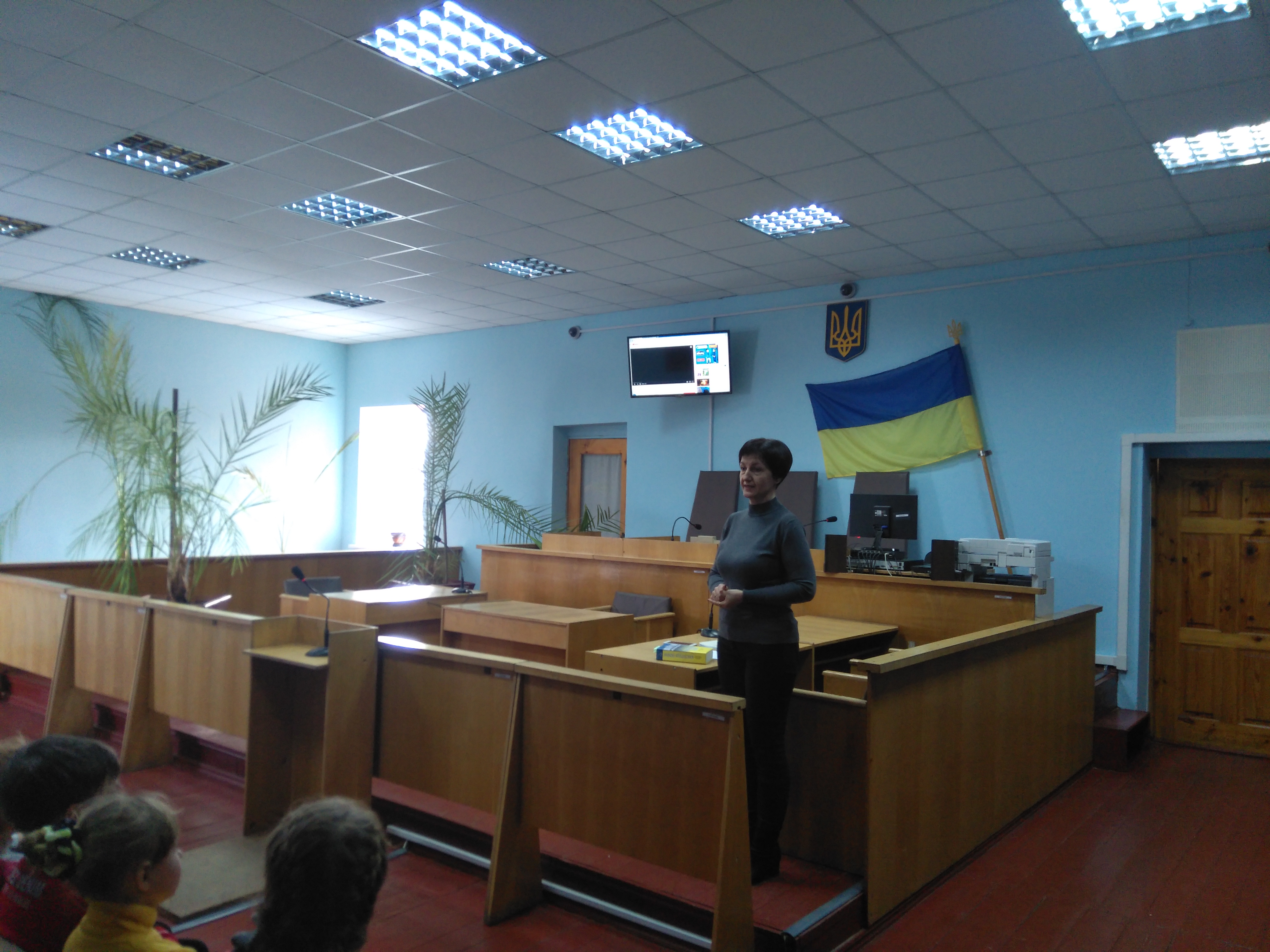 Потім хлопців та дівчат запросили до зали судових засідань, де розглядаються кримінальні справи. Діти з цікавістю розглядали, які місця займають судді, адвокати, прокурори, а також підозрюваний чи обвинувачений.