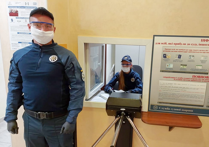 Судові охоронці несуть службу в захисних масках, окулярах і рукавичках, а кожний пункт пропуску забезпечений засобами для дезінфекції рук та предметів.