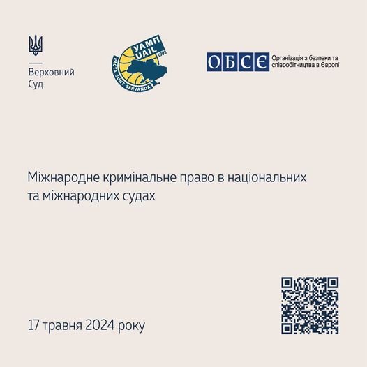 17 травня 2024 року Верховний Суд спільно з Українською асоціацією міжнародного права та Програмою підтримки ОБСЄ для України проведуть Третю щорічну науково-практичну конференцію «Міжнародне кримінальне право в національних та міжнародних судах». Серед учасників заходу – судді, адвокати, прокурори, науковці, національні та міжнародні експерти, представники Європейського суду з прав людини і Міжнародного кримінального суду, а також представники органів державної влади України.