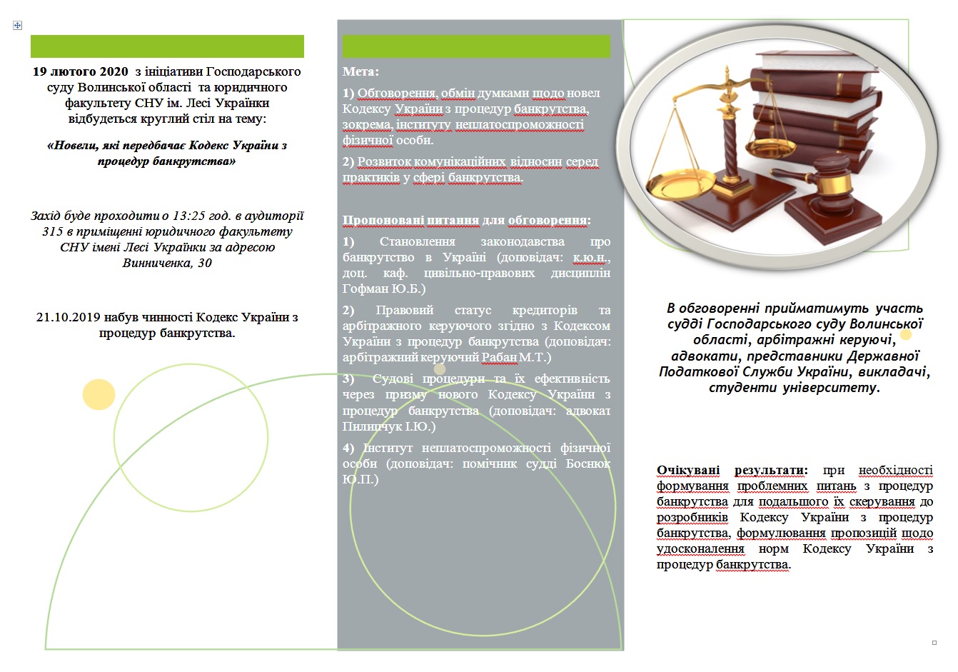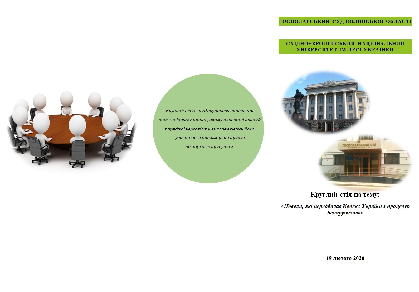 19 лютого 2020 з ініціативи Господарського суду Волинської області та юридичного факультету СНУ ім. Лесі Українки відбудеться круглий стіл на тему: